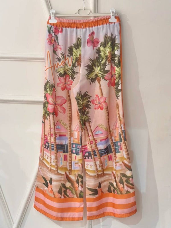 Pantalon double face en Lin . Devant imprimé rayé rose/terracotta,derrière imprimé Riviera.